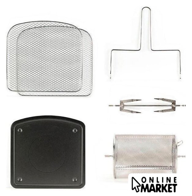 | Комплект поставки | две решетки для духовки, корзина для жарки, противень и вращающийся вертел для запекания. |