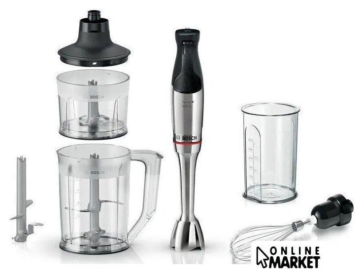 | Комплектация | погружной блендер, венчик для взбивания, мерный стакан, съемная металлическая ножка, измельчитель 500 мл и 1300 мл, нож для колки льда, инструкция |