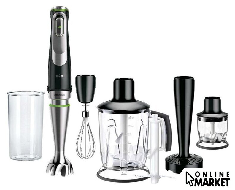 Комплектация | насадка блендер-измельчитель 1250 мл, мерный стакан 600 мл, насадка для приготовления пюре, насадка-венчик для взбивания, насадка-измельчитель 350 мл, нож для измельчения |