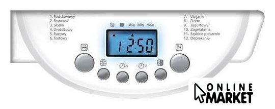 | Перечень режимов работы | 1. Классический.2. Французский.3. Сладкий.4. Дрожжевой.5. Грубого помола.6. Тостовый.7. Йогуртовый.8. Взбивание.9. Джем.10. Замес.11. Быстрая выпечка.12. Выпечка. |