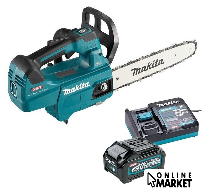 Комплект поставки | - Бензопила UC002GZ01 XGT 40В- 1 аккумулятор MAKITA 4,0 Ач BL4040 XGT- Зарядное устройство MAKITA DC40RA- Направляющая 10 дюймов / 25 см, 3/8 дюйма, 1,3 мм: 168408-5- Пильная цепь, 25 см / 3/8 дюйма: 196205-9 |