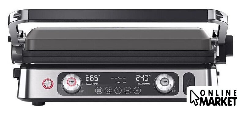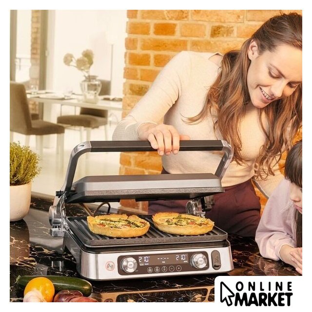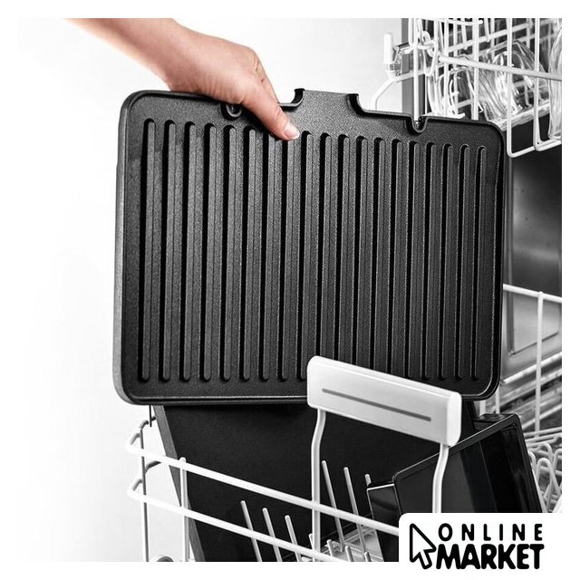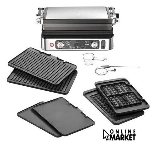 Комплектация | Электрогриль со съемными нагревательными пластинами: гладкая, ребристая, вафельницаТермощупМерная чашечка |