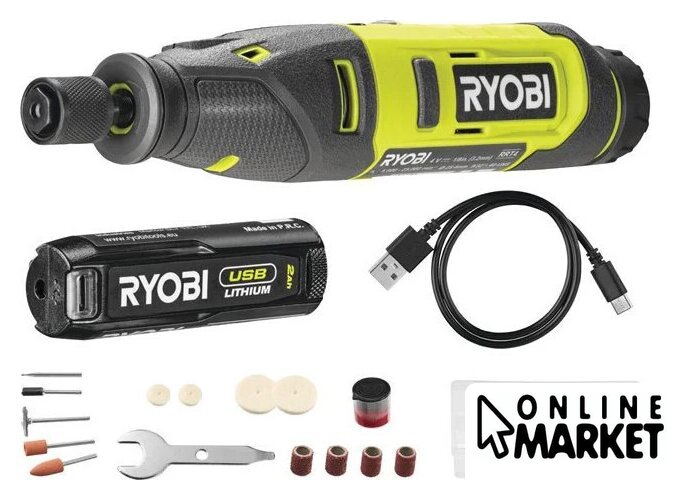 Комплектация | - 15 аксессуаров - (гравировальная фреза 1,6 мм, 2x 13 мм и 2x 25 мм войлочные полировальные круги, полировальная оправка, полировальная паста, щетка из углеродистой стали 19 мм, 4 шлифовальные ленты 6,4 мм (2x 60 зернистость, 2x 120 зернистость), 6,4 мм шлифовальная оправка, шлифовальные камни из оксида алюминия (1 цилиндрический 9,5 мм, 1 конический 9,5 мм)), - футляр для хранения принадлежностей и гаечный ключ, - аккумулятор 2,0 Ач (RB420) - провод для зарядки USB C |