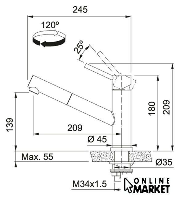 | Поворотный излив | 120 ° |
