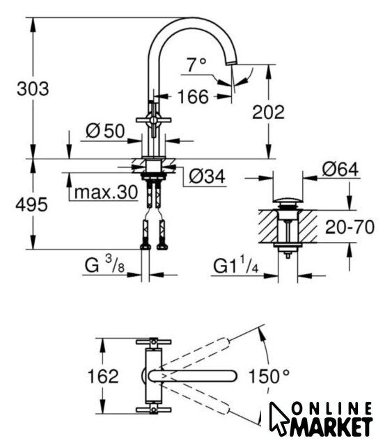 | Поворотный излив | 150 ° |