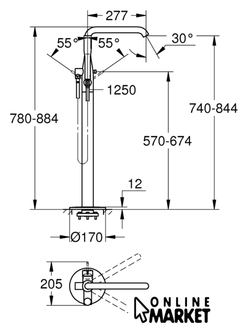 смеситель, монтаж на пол