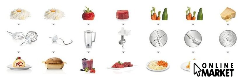 Функции | мясорубка, блендер, взбивание, смешивание, замешивание дрожжевого теста, терка, шинковка, ломтерезка |