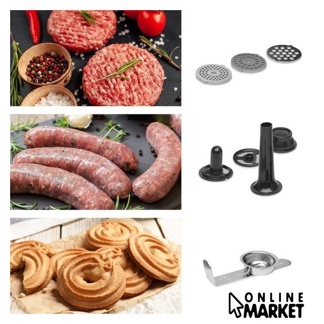 | Полная комплектация | Миска из нержавеющей стали 5 л с ручкой + крышкойВенчикГибкий наконечникМешалкаКрючок для замешиванияМясорубка (3 сменных диска с разной толщиной помола) + аксессуары для фарширования колбас + аксессуары для приготовления печеньяТерка с 5 сменными насадками. |