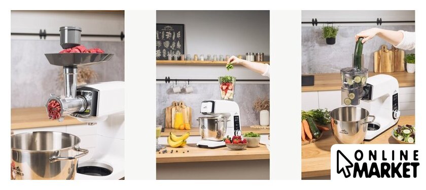 | Функции | мясорубка, блендер, взбивание, смешивание, замешивание дрожжевого теста, терка, шинковка, ломтерезка |