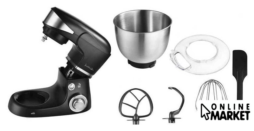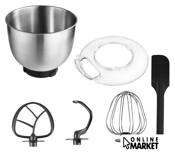| Полная комплектация | Чаша 5 лВенчикНасадка для тестаНасадка для смешиванияЛопаткаКрышка от брызг |