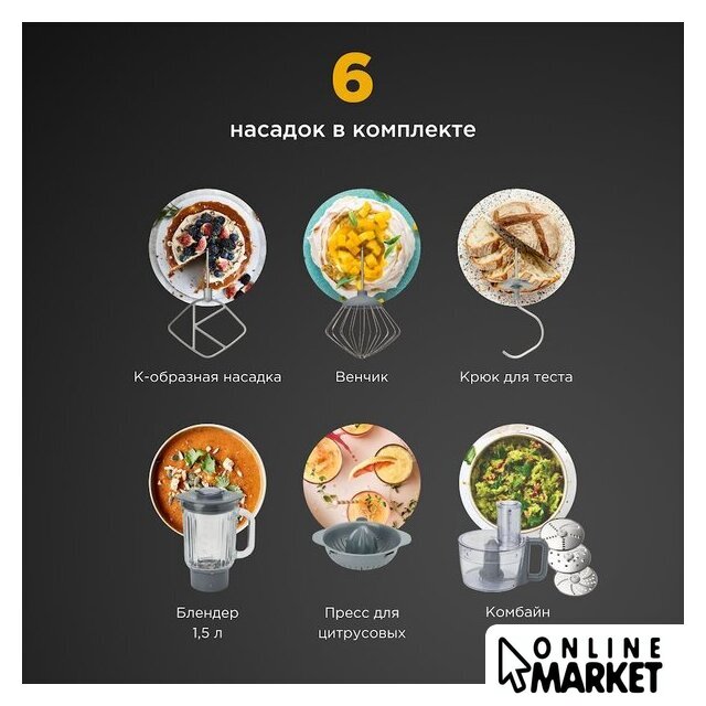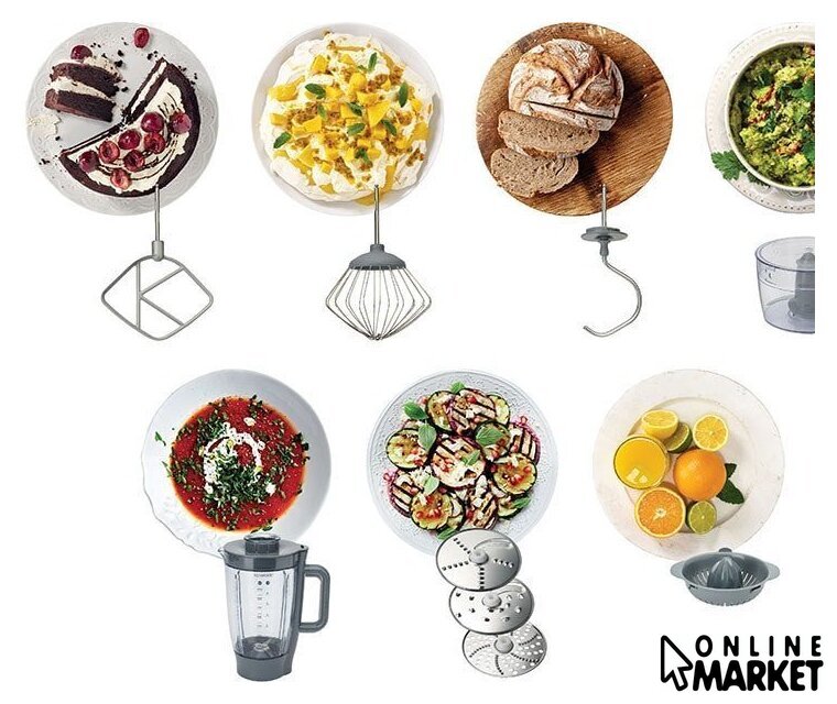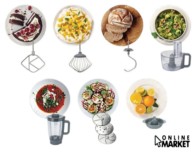 | Функции | блендер, цитрус-пресс, взбивание, смешивание, замешивание дрожжевого теста, измельчитель, рубка, терка, шинковка, ломтерезка, драники |