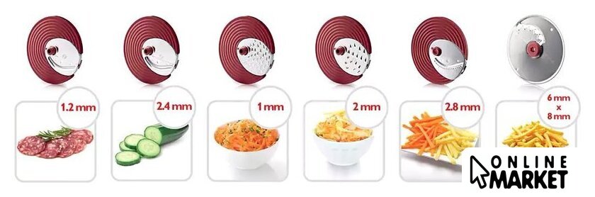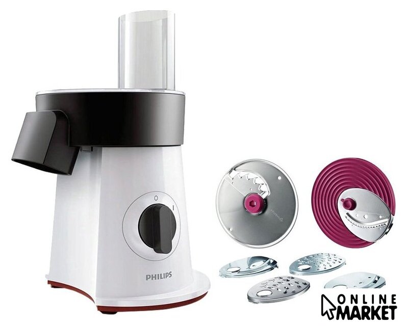 Полная комплектация | Аксессуары в комплекте:• Диск для нарезки крупными ломтикам• Диск для нарезки тонкими ломтикам• Диск для крупной шинковки• Диск для мелкой шинковки• Диск для нарезки соломкой• Диск для нарезки картофеля фри |