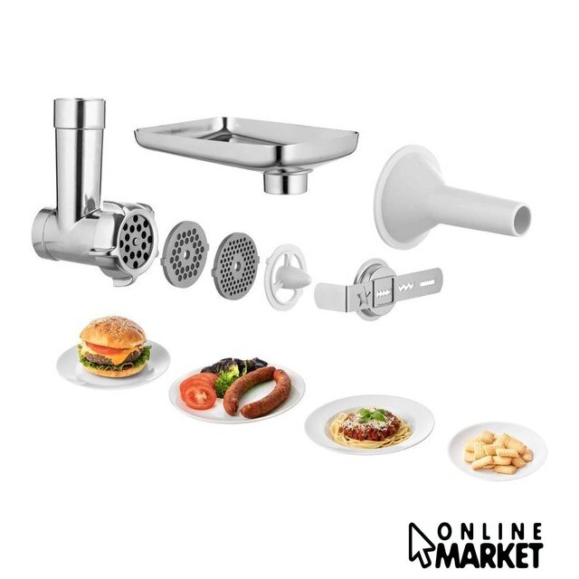 Полная комплектация | Стеклянная чаша блендера 1,5лЧаша миксера 4,5лДве насадки для смешиванияНасадка для тестаВенчикМясорубка с насадками для регулировки степени измельчения, набивки колбас и насадкой-шаблоном для формовки печеньяТолкатель |