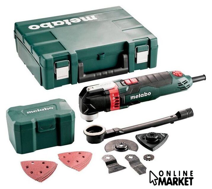 Комплект поставки | - Погружное пильное полотно 32 мм HCS (дерево)- Пластиковый кофр- Сегментное пильное полотно 85 мм BiM (дерево + металл)- Жестко закрепленный шабер 52 мм HCS- Треугольная шлифовальная пластина 93 мм на липучке- 5 шлифовальных листов на липучке, 93 мм P 80- 5 шлифовальных листов на липучке, 93 мм P 120- Переходник устройства пылеудаления- Мультиадаптер- Ящик для инструментов |