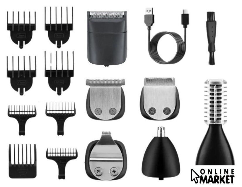 | Насадки | гребни, точный триммер, для носа и ушей, бритва |