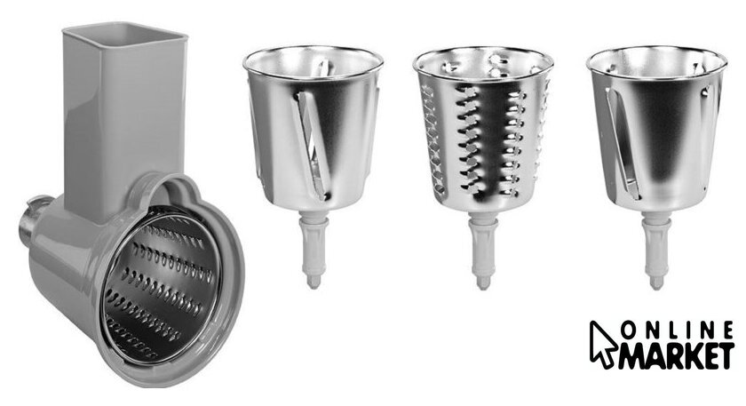 Комплектация | - корпус (пластик) с ключом для замены барабанов (нержавеющая сталь);- толкатель (пластик);- 4 барабана из нержавеющей стали для натирания и нарезки: крупная и мелкая терка, средняя и мелкая нарезка (нержавеющая сталь). |