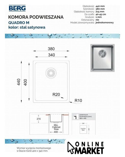 | Комплектация | Злевоzmywak wyposażony w korek ręczny, zestaw przelewowo odpływowy z przedłużką i syfonem oraz elementy mocujące |