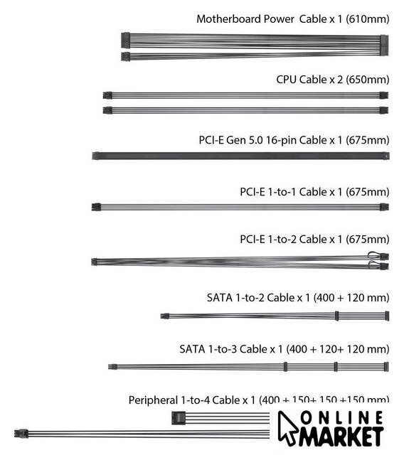 | Комплектация | Power Cord x 1Motherboard Power Cable x 1 (610mm)CPU Cable x 2 (650mm)PCI-E Gen 5 16-pin Cable x 1 (675mm)PCI-E (16-pin to 8-pin-8-pin) Cable x 1 (675mm)PCI-E 1-to-1 Cable x 1 (675mm)SATA 1-to-2 Cable x 1 (400+120mm)SATA 1-to-3 Cable x 1 (400+120+120mm)Peripheral 1-to-4 Cable x 1 (400+150+150+150mm)TUF Gaming Cable Tie x 3User Manual x 1 |