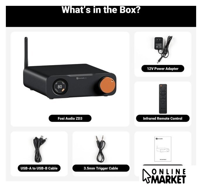 | Комплект поставки | - кабель USB Type-B - USB Type-A- Bluetooth антенна - адаптер питания - 12V Trigger кабель - пульт д/у - документация |
