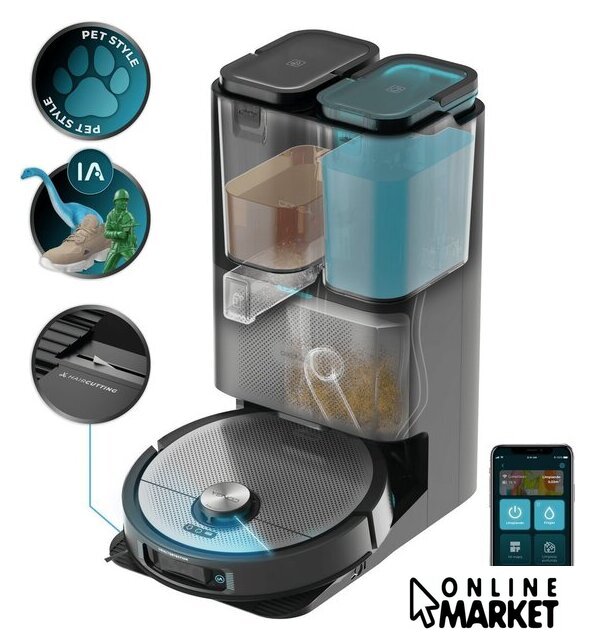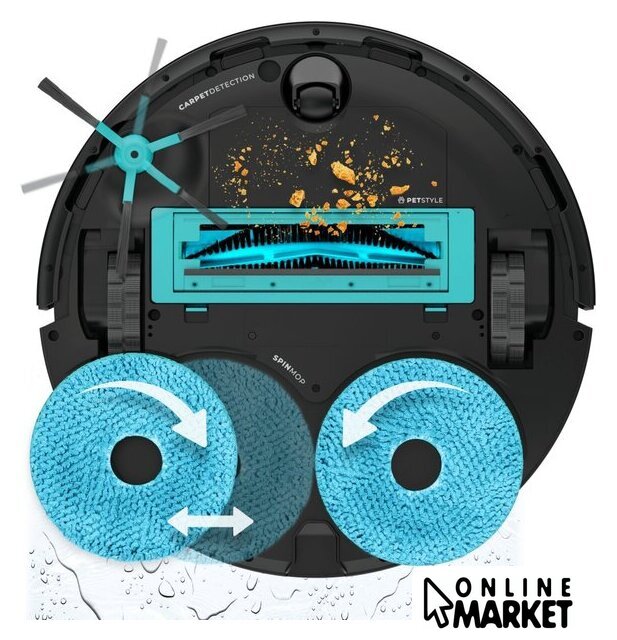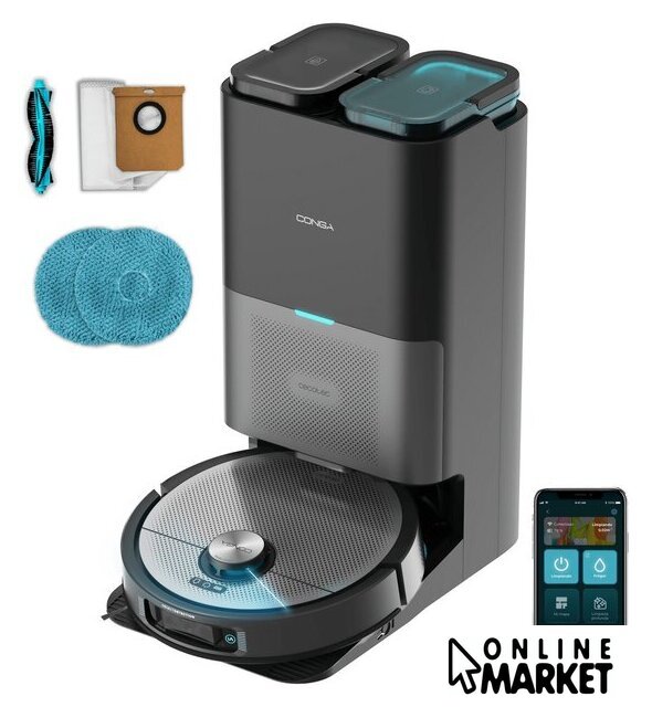 | Комплектация | база самоочистки; боковая щетка; щетка мультифункциональная; вращающиеся швабры; бутылка для моющего средства; мешок для пыли |