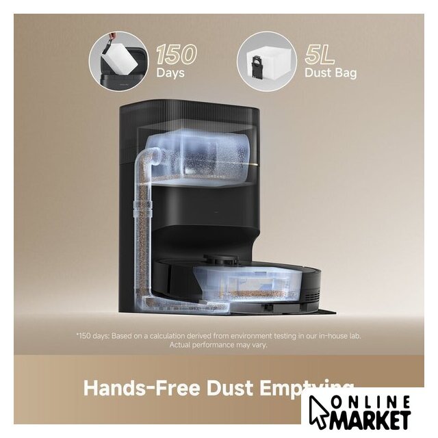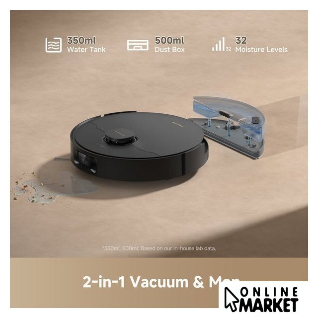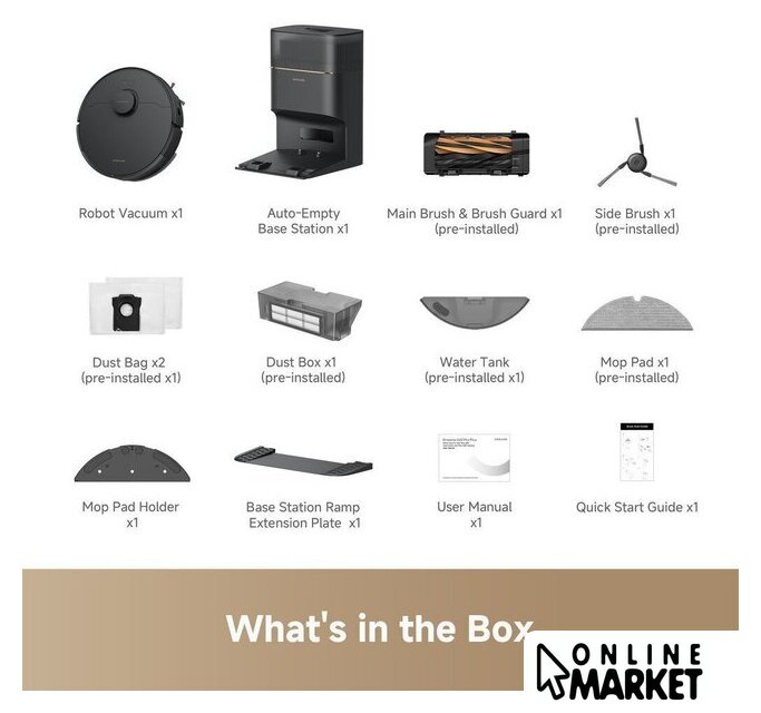 | Комплектация | автоочищающаяся база, основная щетка с защитой, боковая щетка, сменные мешки для пыли, насадка для влажной уборки, крепление для мопа, удлинительная пластина для заезда на базу, руководство по быстрому запуску |