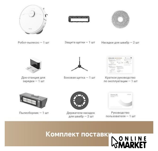 | Комплектация | Робот-пылесос 1Док-станция для зарядки 1Боковая щетка 1Шнур питания 1Основная щетка 1Защита щетки 1Пылесборник 1Держатели насадок для швабр 2Насадки для швабр 2Руководство пользователя 1Краткое руководство по эксплуатации 1 |