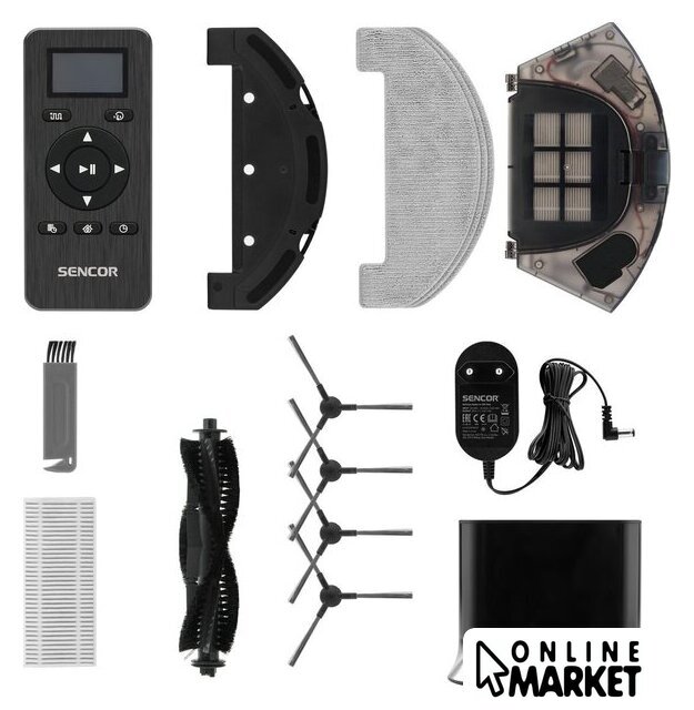 | Комплектация | две боковые щетки, фильтры, зарядная станция, насадка для влажной уборки, 3 сменные салфетки для влажной уборки, пульт ДУ, 2 батарейки AAA, 2 запасные боковые щетки, адаптер питания, запасной HEPA-фильтр, запасной поролоновый фильтр, щетка для чистки |