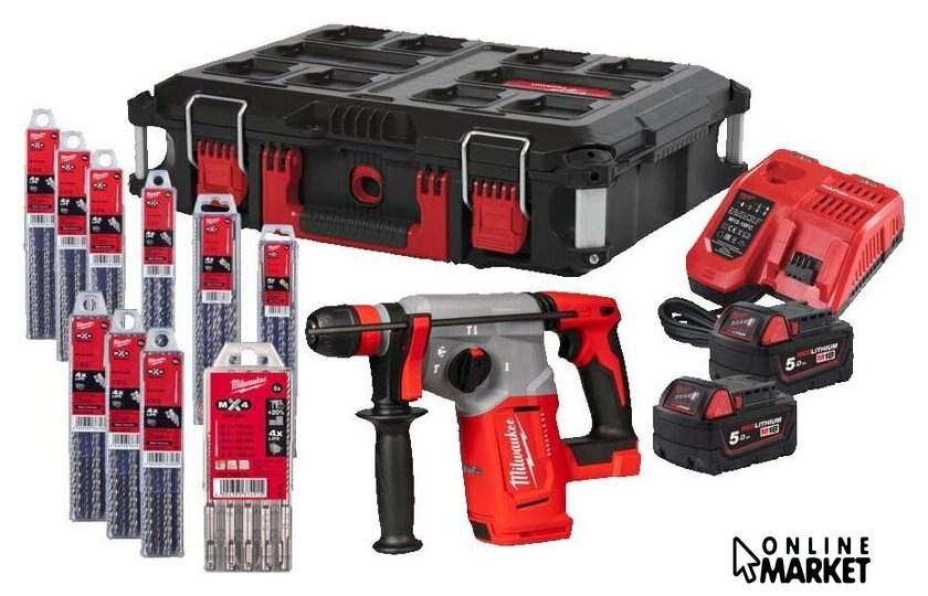 | Комплект поставки | - 3×SDS-Plus MX4 (10шт), - 3×SDS-Plus MX4 (10шт), - сверло с 4 гранями 10x215 мм (10шт),- сверло с 4 гранями 12x210 мм (10шт), - сверло с 4 гранями 12x260 мм (10шт), - 5 сверл с 4 гранями MX4 SDS-Plus, - быстрое зарядное устройство M12-M18 FC,- 2 аккумулятора M18 5Ач |
