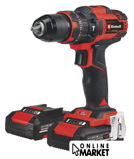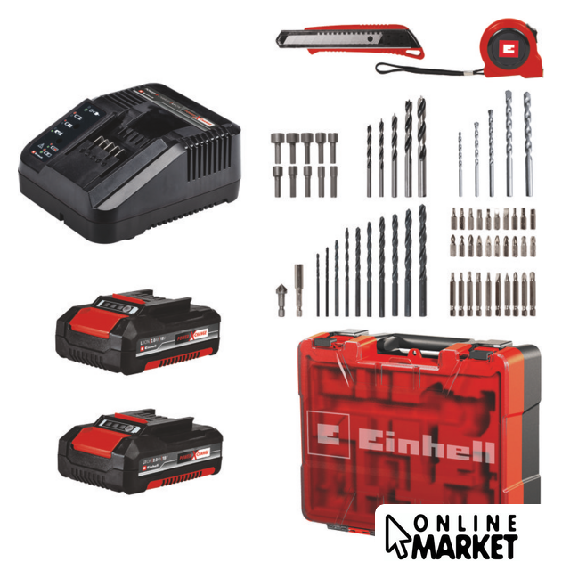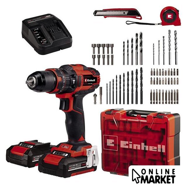 | Комплектация | - Аккумуляторная дрель- 2 аккумулятора 18В- Зарядное устройство- Набор оснастки из 64 предметов- Инструкция- Кейс |