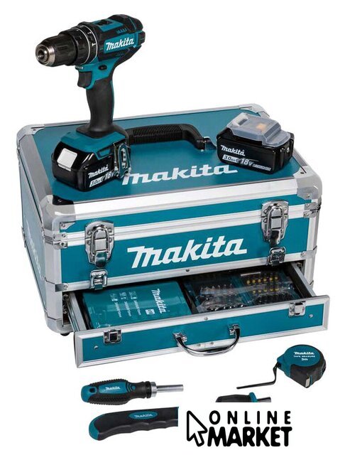 Комплектация | - DHP482- Алюминиевый ящик (197019-9)- Быстрозарядное устройство DC18RC (195584-2)- 2x аккумуляторная батарея BL1830B (197599-5)- Сверлильный патрон 13 мм (199154-9)- Крышка аккумуляторного отсека (450128-8)- Двойная бита (784636-0)- 2 набора бит (B-28606)- Набор сверл (D-46202)- Нож с отламывающимся лезвием (D-65713)- Измерительная лента (Q485) |