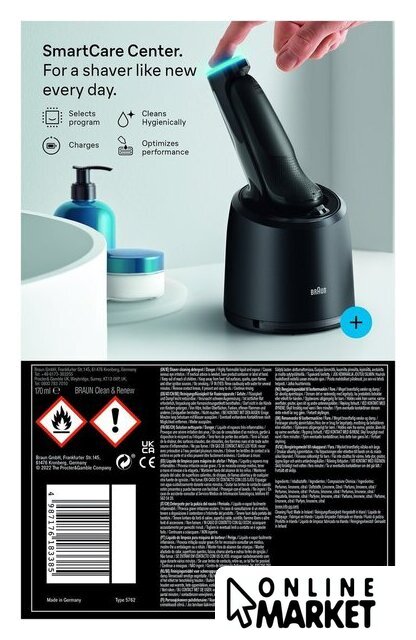 | Комплект поставки | - электробритва, - станция для автоматической очистки, - картридж для очистки, - адаптер питания SmartPlug, - щеточка для чистки |