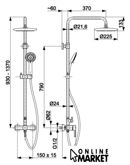 | Диаметр (ширина) верхнего душа | 225 мм |