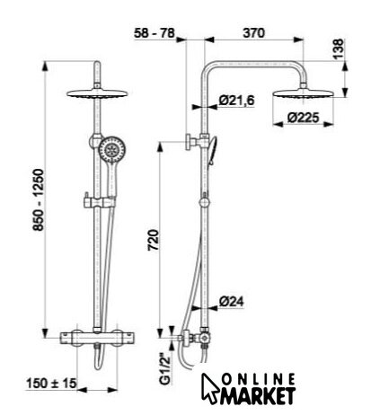 | Диаметр (ширина) верхнего душа | 225 мм |