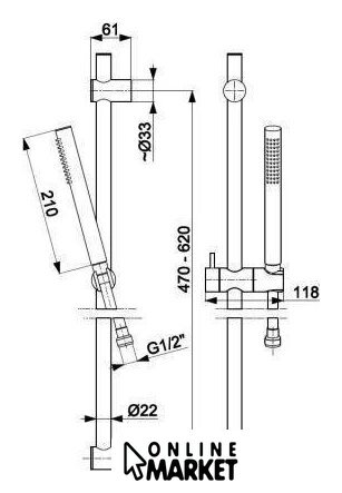 душевой гарнитур (без верхнего душа), настенный монтаж, отсутствует смеситель