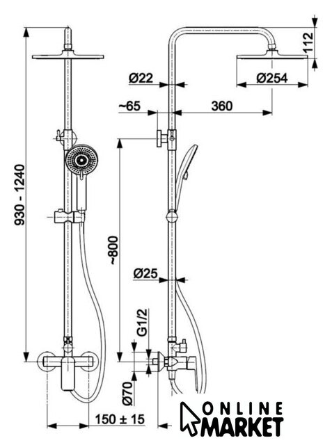 | Диаметр (ширина) верхнего душа | 254 мм |