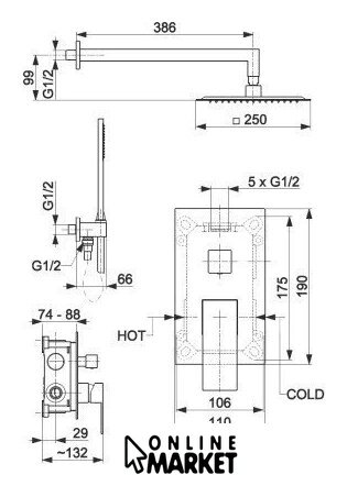 | Комплектация | верхний душ, штанга, ручной душ (лейка), держатель лейки, шланг, смеситель |