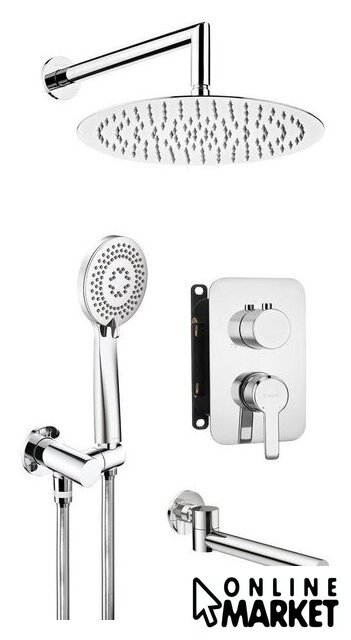| Комплектация | верхний душ, ручной душ (лейка), держатель лейки, шланг, смеситель, излив для ванны |