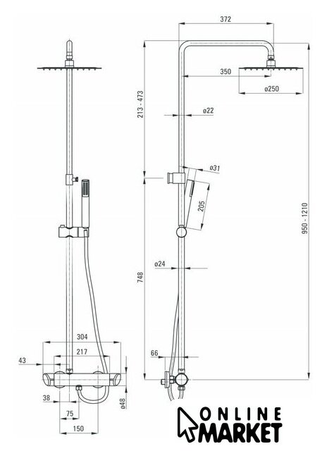 | Диаметр (ширина) верхнего душа | 250 мм |