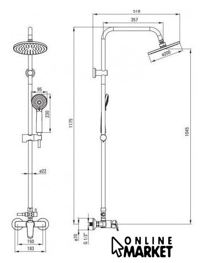| Комплектация | верхний душ, штанга, ручной душ (лейка), держатель лейки, шланг, смеситель |