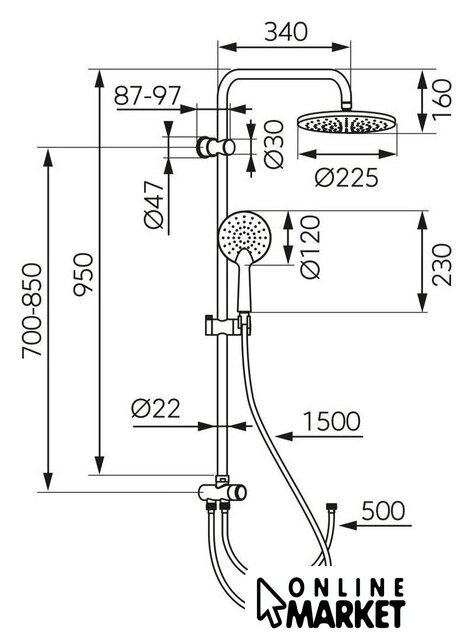 | Диаметр (ширина) верхнего душа | 225 мм |