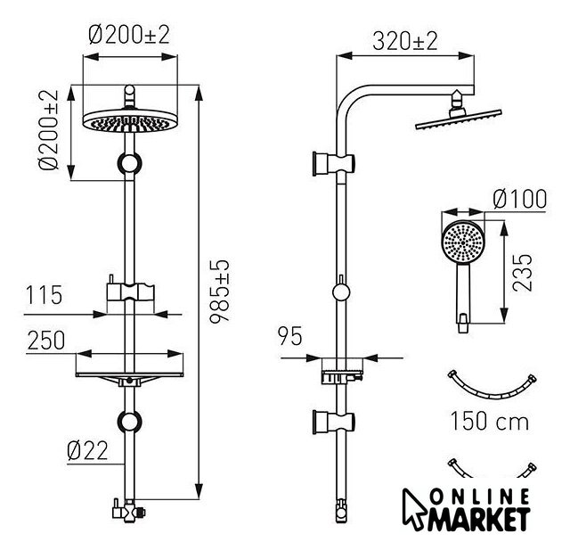 | Комплектация | верхний душ, штанга, ручной душ (лейка), держатель лейки, шланг, полочка |