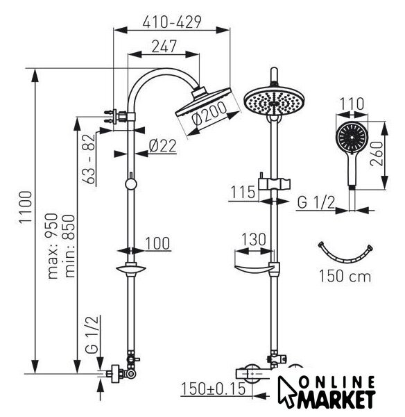 | Комплектация | верхний душ, штанга, ручной душ (лейка), держатель лейки, шланг, смеситель, мыльница или держатель для мыла |