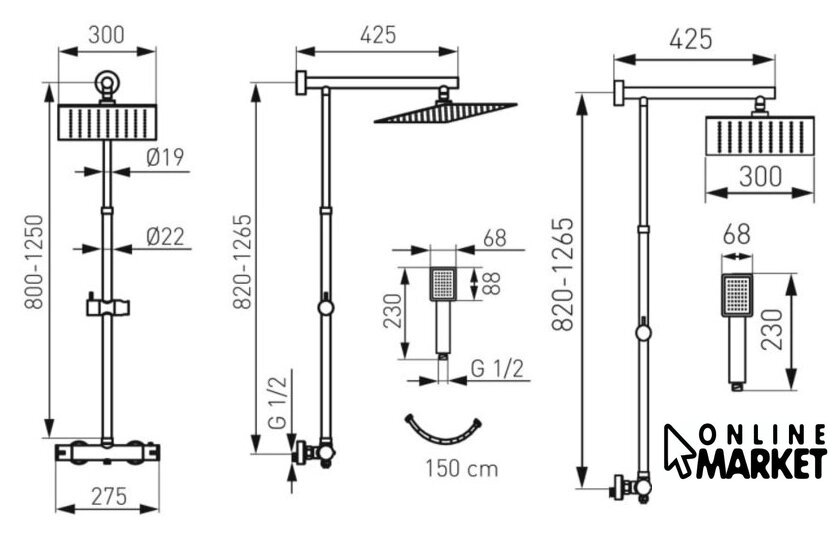| Комплектация | верхний душ, штанга, ручной душ (лейка), держатель лейки, шланг, смеситель |