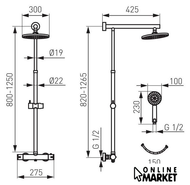 | Комплектация | верхний душ, штанга, ручной душ (лейка), держатель лейки, шланг, смеситель |