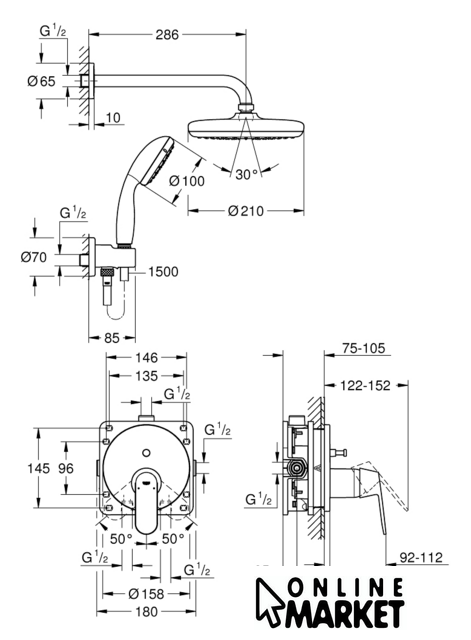 | Диаметр (ширина) верхнего душа | 210 мм |