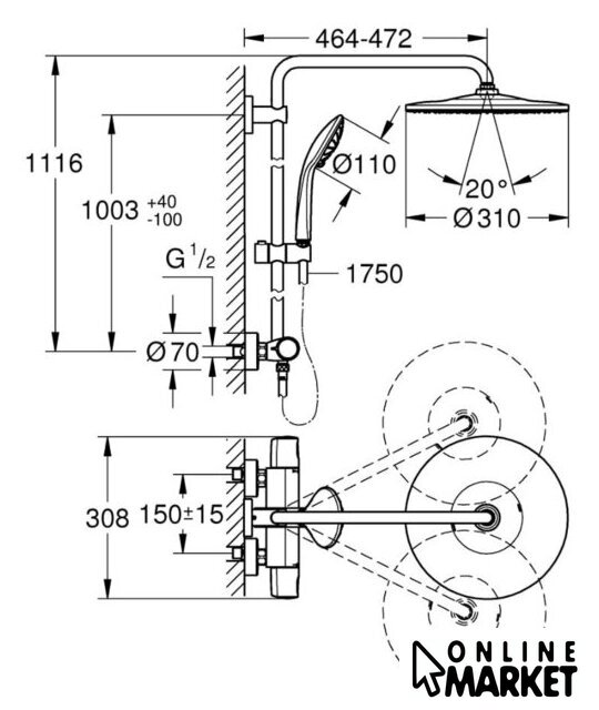 | Вылет верхнего душа | 472 мм |