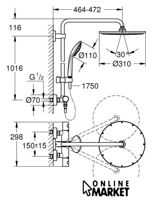 | Диаметр (ширина) верхнего душа | 310 мм |
