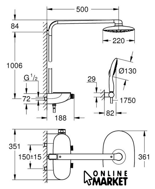 | Комплектация | верхний душ, штанга, ручной душ (лейка), держатель лейки, шланг, смеситель, полочка |