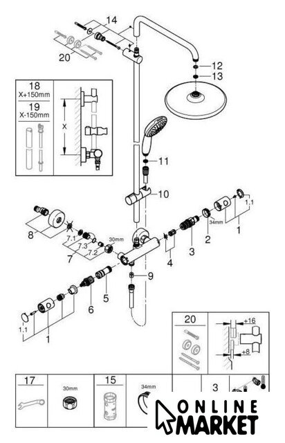 | Комплектация | верхний душ, штанга, ручной душ (лейка), держатель лейки, шланг, смеситель |