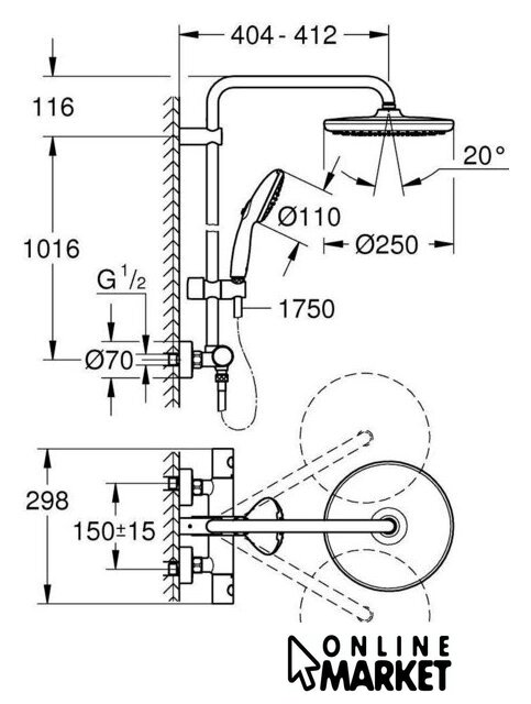 | Вылет верхнего душа | 404 мм |